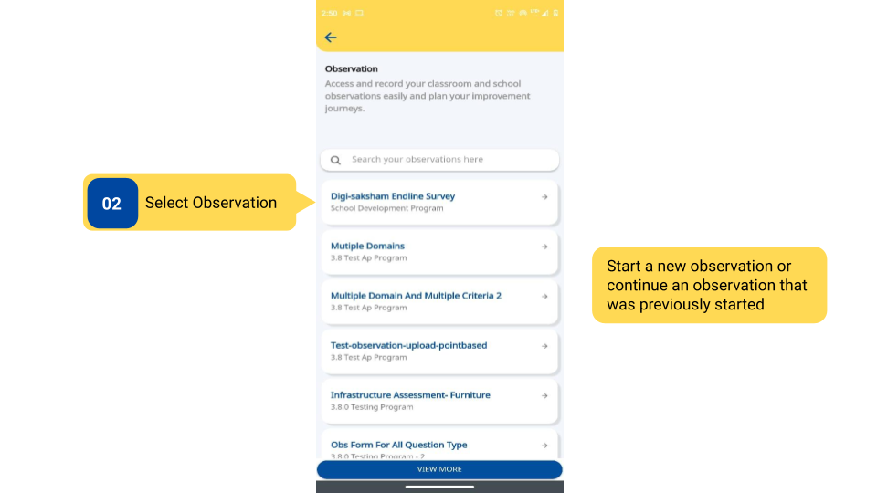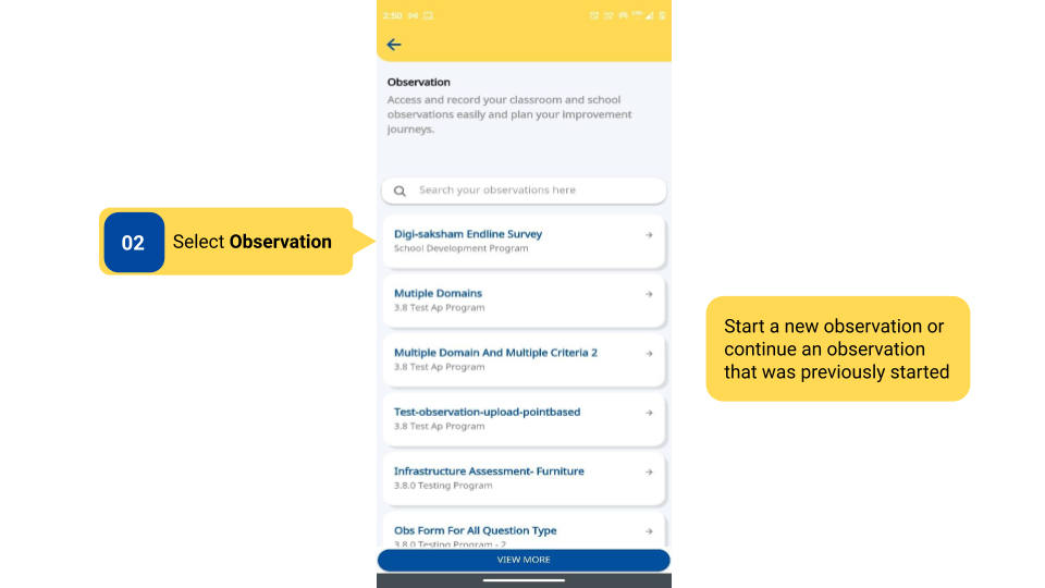 Users can access their mapped Observations using the portal as well. The Observations on the portal are also available for the targeted users only (HT & Officials and Teachers).