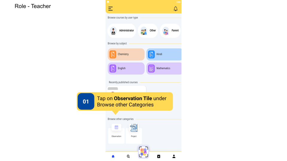 Teachers can access Observations using the Observation tile in the Browse other categories section, through links and QR codes, provided it is enabled for the board selected in the profile.