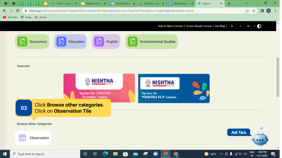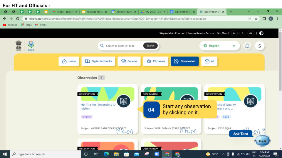 DIKSHA Observations are created by Content Creator and can be viewed by signed-in users who are logged in as HT & Officials or teacher profiles.