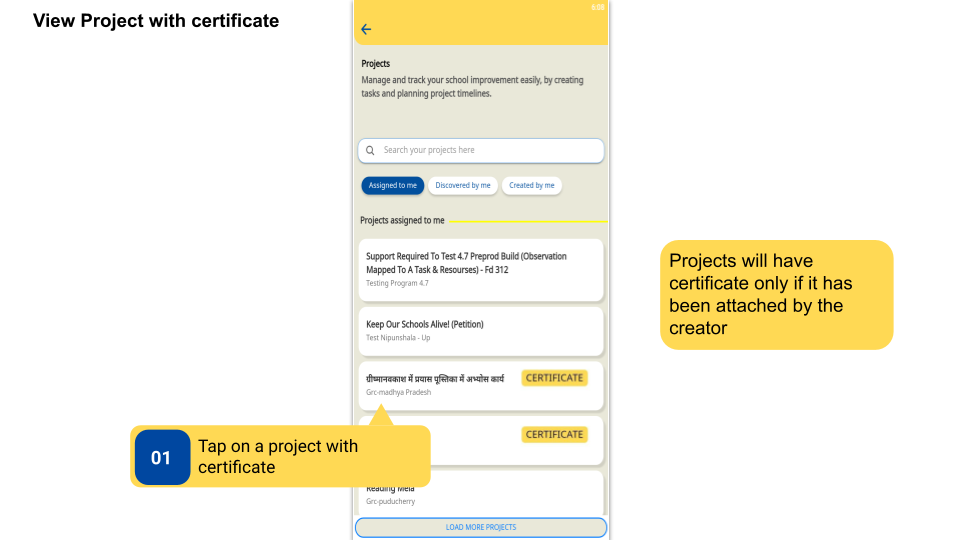 Users can receive certificates for certain projects, view Project Learning Resource, add files and remarks, and sync project to DIKSHA Database.