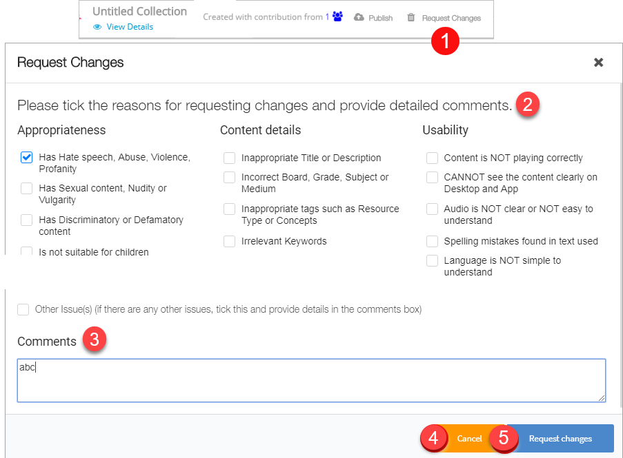 | 1. Click Request Changes to notify the creator to make changes in the book according to the guidelines. The Request Changes page is displayed
