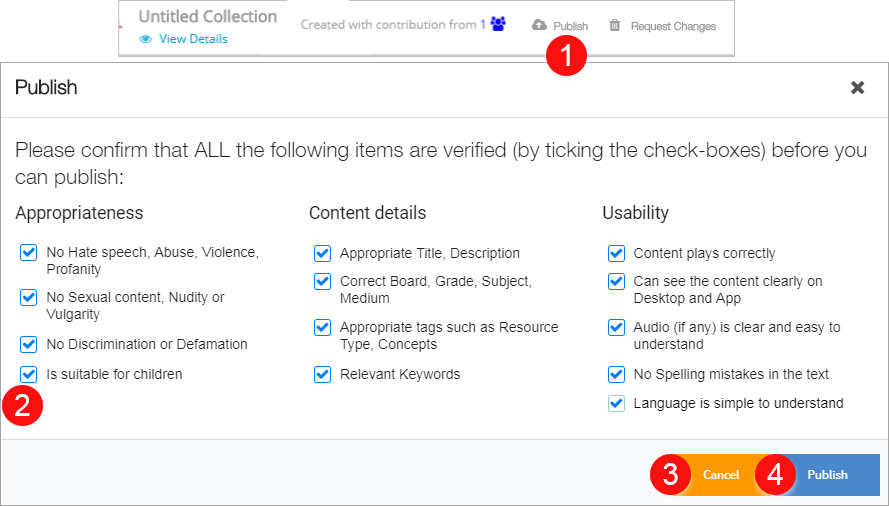 2. Select all check boxes to confirm appropriateness, relevance, and usability of the book 3. Click Cancel to cancel 4. Click Publish to publish the book Note: Once published the creator is notified of the same and the book becomes available in the Library section of DIKSHA |