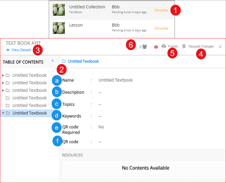 2. You can view the following details of the book: a. Name b. Description c. Topics d. Keywords e. QR code Required f. QR code 3. Click View Details to view the book deatils 4. Click Request Changes to notify the creator to make changes in the book according to guidelines 5. Click Publish to publish the book 6. Click Contributor icon to view the list of contributor |